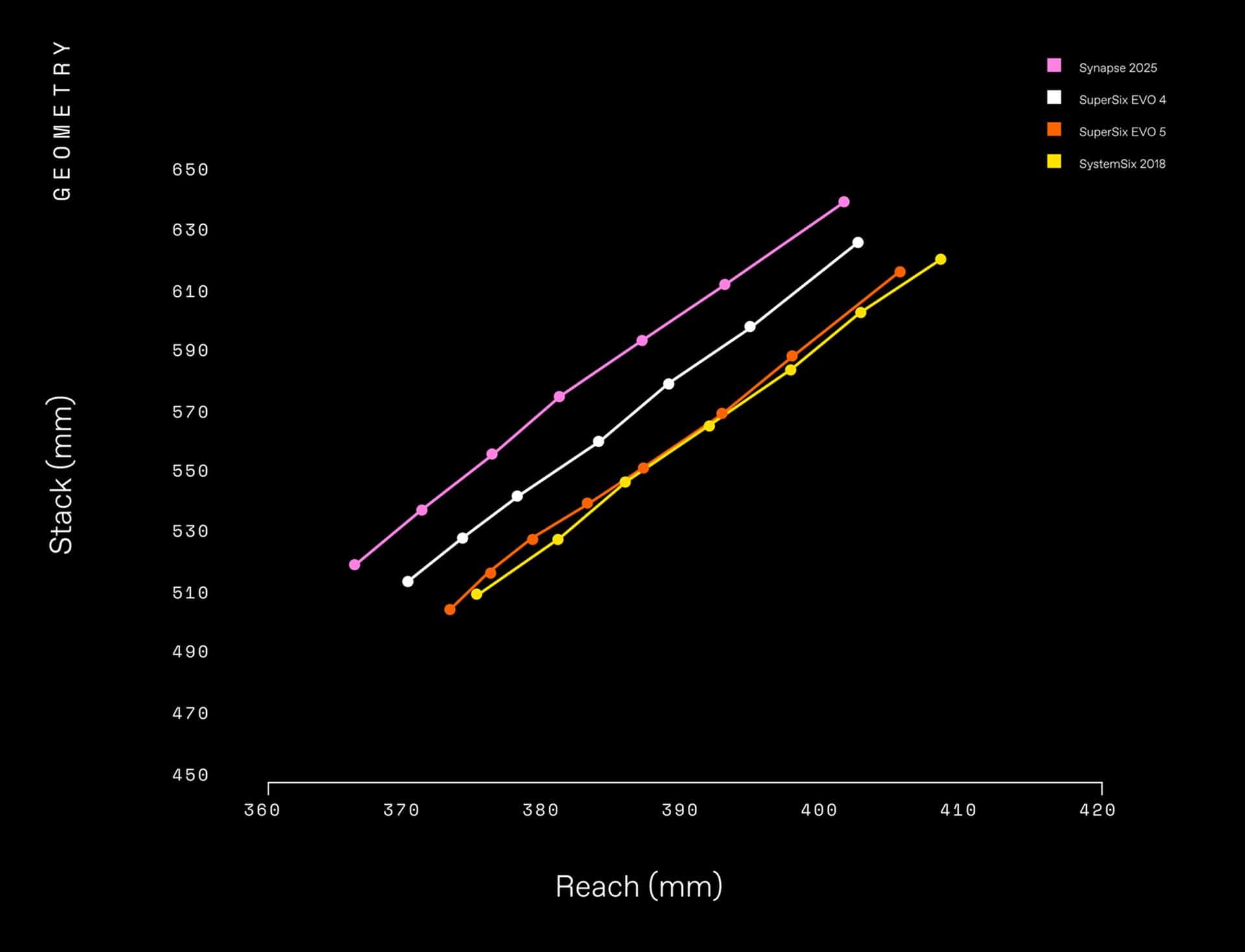 レースパフォーマンスへのこだわりが、フレームジオメトリーの改良へと私たちを導いた。レーサーのニーズにより的確に応えるために。第4世代と比べ、全サイズでスタックを10mm低く設定。