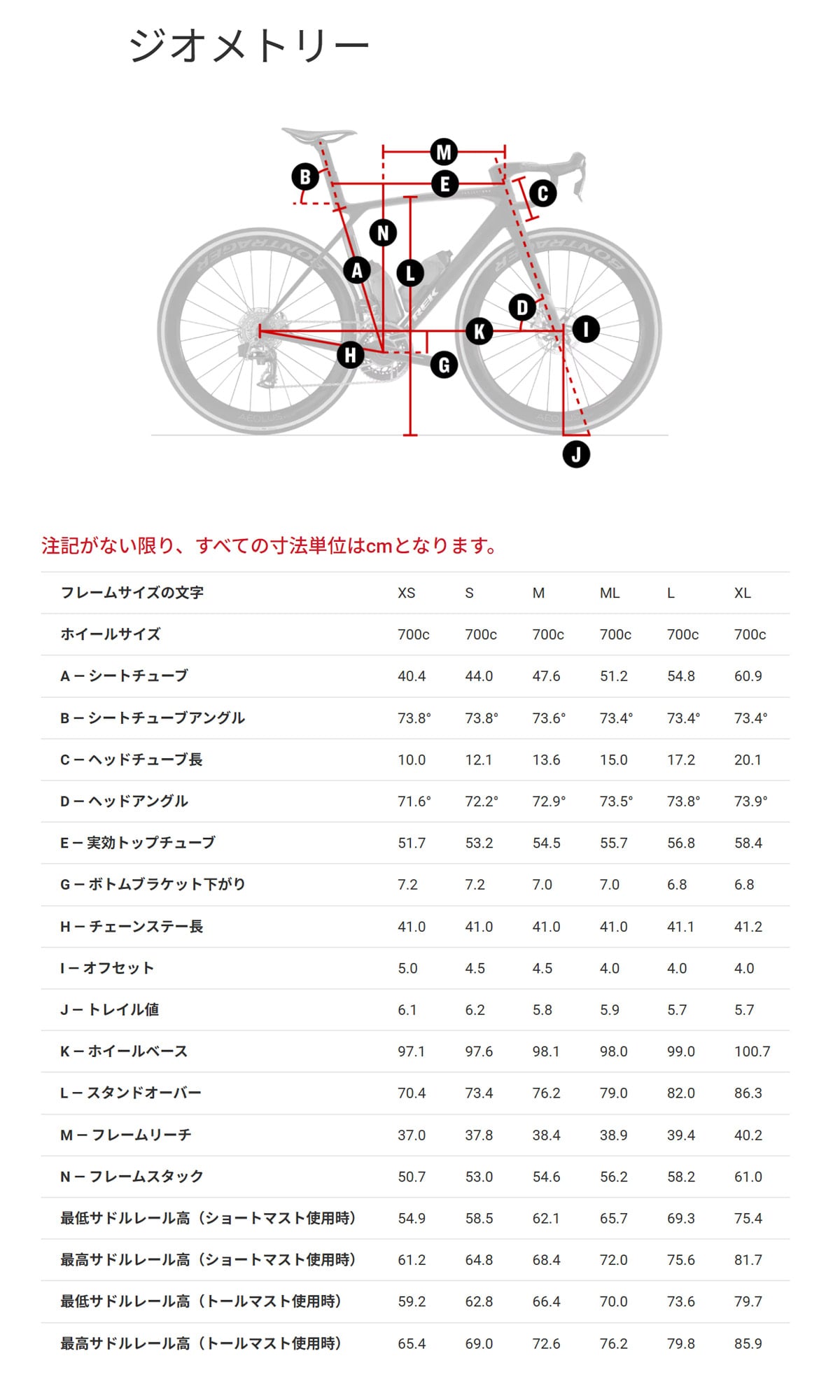 | その他 | TREK社は通知することなく製品情報をいつでも変更する権利を保有しています。 これには、TREK社のエキップメント、仕様、モデル、カラー、及び材質に関するものが含まれます。 サプライチェーンの問題から、互換性のある部品は予告なく代用されることがあります。 |