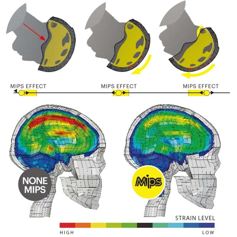 MIPSは、多方向からの衝撃を分散させることにより、脳へのダメージを軽減させるテクノロジー。斜め方向の衝撃に対して外部のシェルと内部のライナーが微量に可動し、回転重力による頭部へのダメージを分散することで、脳へのダメージを軽減します。