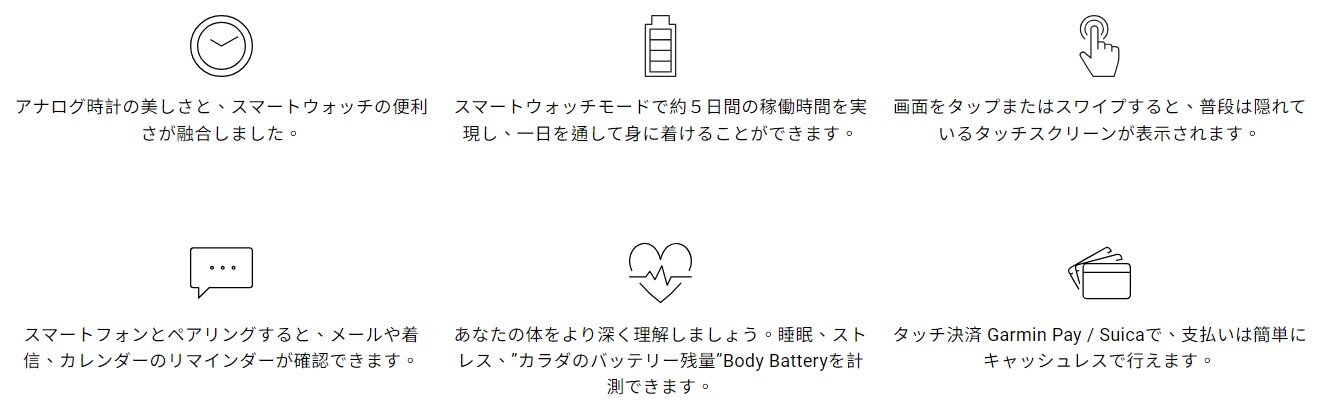 | 充電方式 | Garmin独自のクリップ式充電ケーブルによる有線充電 / Qi規格対応ワイヤレス充電パッドによるワイヤレス充電 |