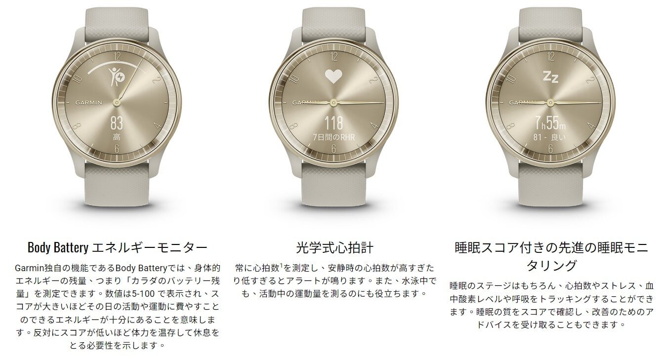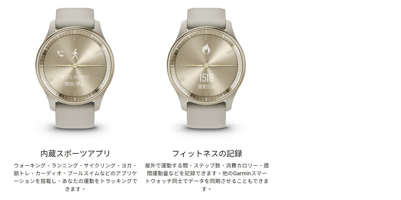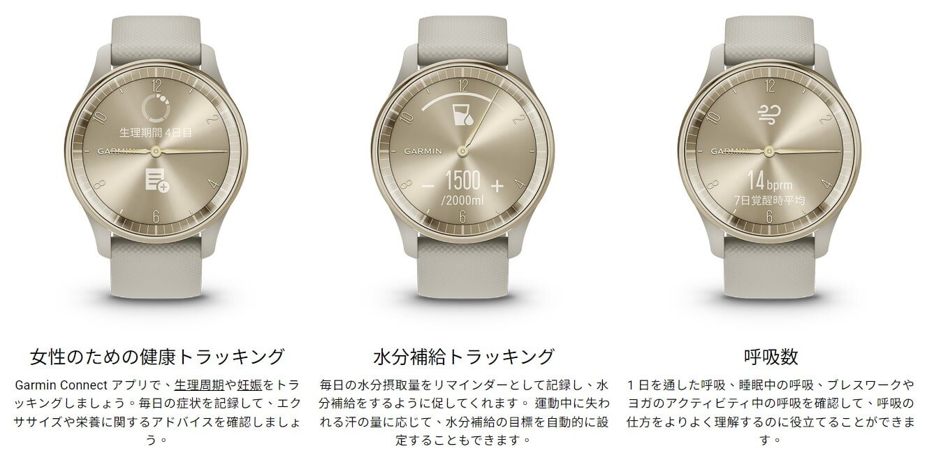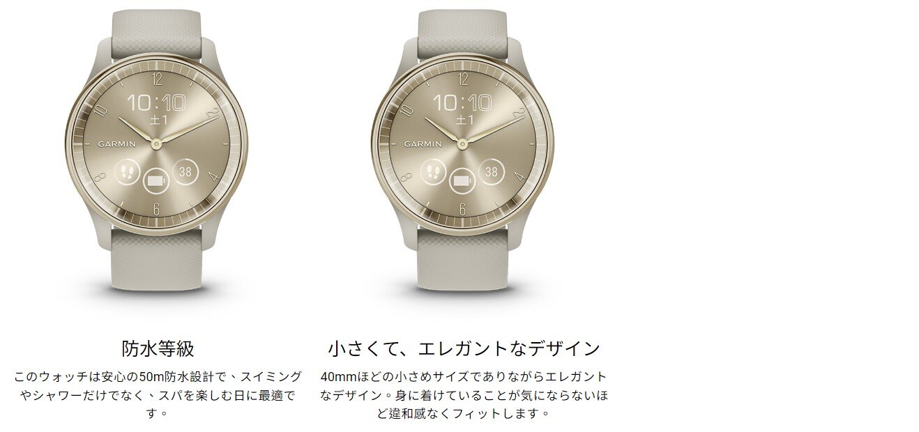 | 標準付属品 | vivomove Trend本体 USB-C チャージングケーブル(TypeC) ※付属のケーブルを使用してのパソコン接続時及び充電時にはUSB-C対応の差込口/コネクタが必要となります。 クイックスタートマニュアル 標準付属ベルト Quick Release バンド 20mm(本製品には短い方のバンドのみ付属します) |
