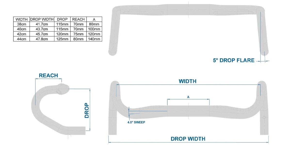 | ドロップ/リーチ | 380mm=115/70mm 400mm=115/70mm 420mm=120/75mm 440mm=125/80mm |