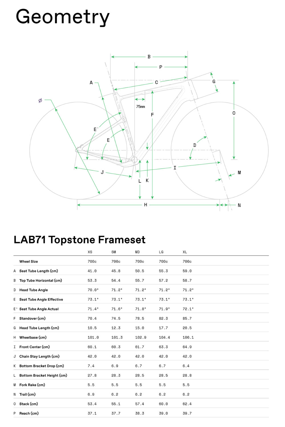 | Frame | LAB71 Topstone, Superlight Series 0 Carbon Construction, Kingpin suspension system, SmartSense compatible, Proportional Response construction, 12x142mm thru-axle, 27.2 dropper post ready, BSA 68mm threaded BB, DirectLine internal cable routing, removable fender bridge, multiple gear/bottle mounts |