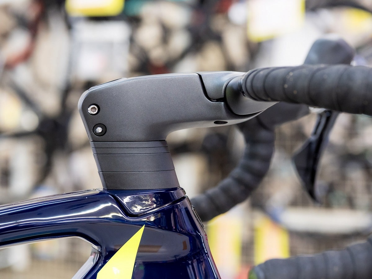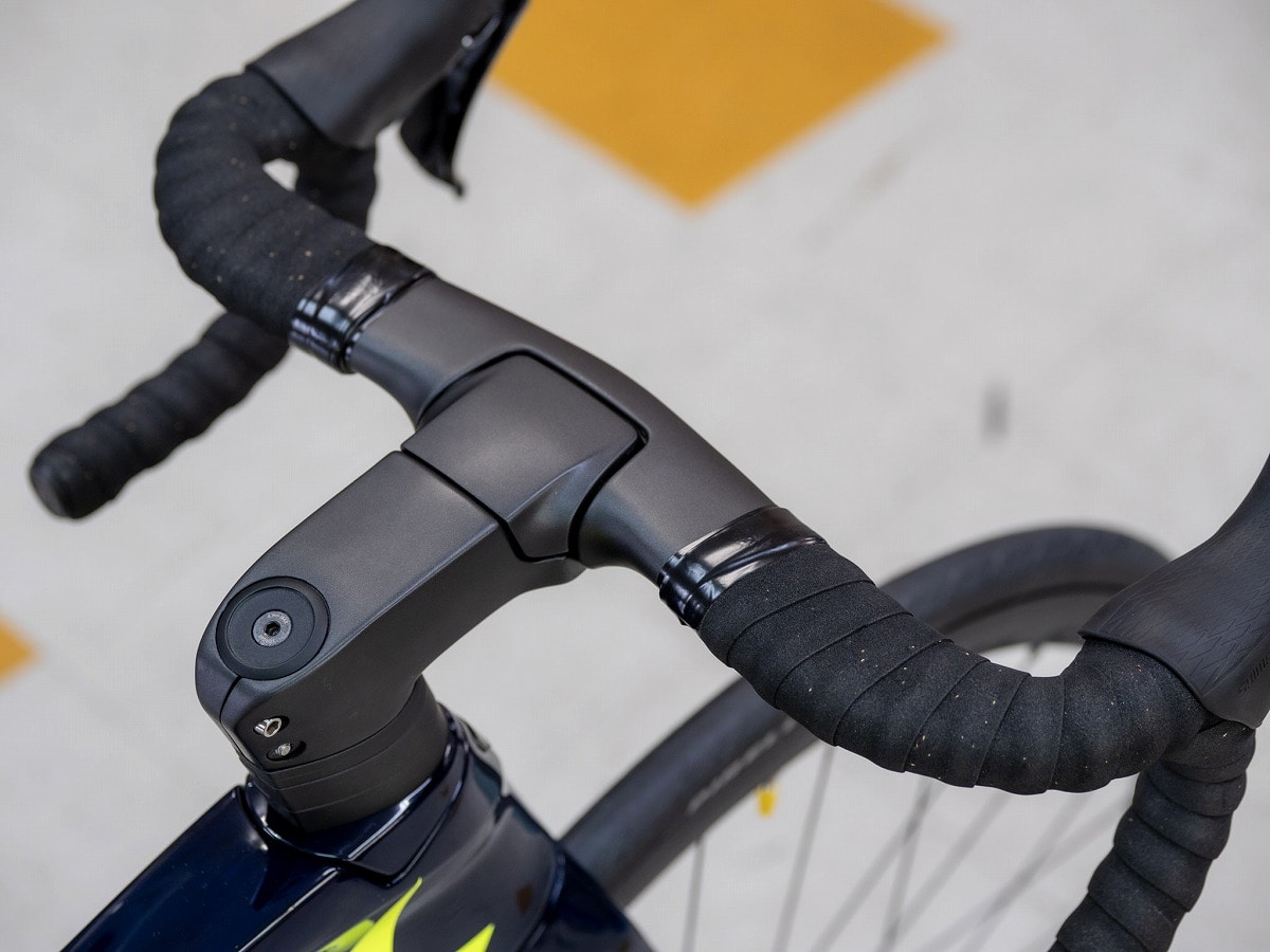 今ではどのブランドもハイエンドモデルはステアリングフル内装のモデルが多いですが、この世代のMADONE によく似合うボリューミーで独特な形のステム/ハンドルも微妙なポジション調整も可能となっており、走るシチュエーションによって細かくポジションを変えるユーザーには嬉しいポイントでしょう。