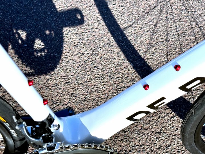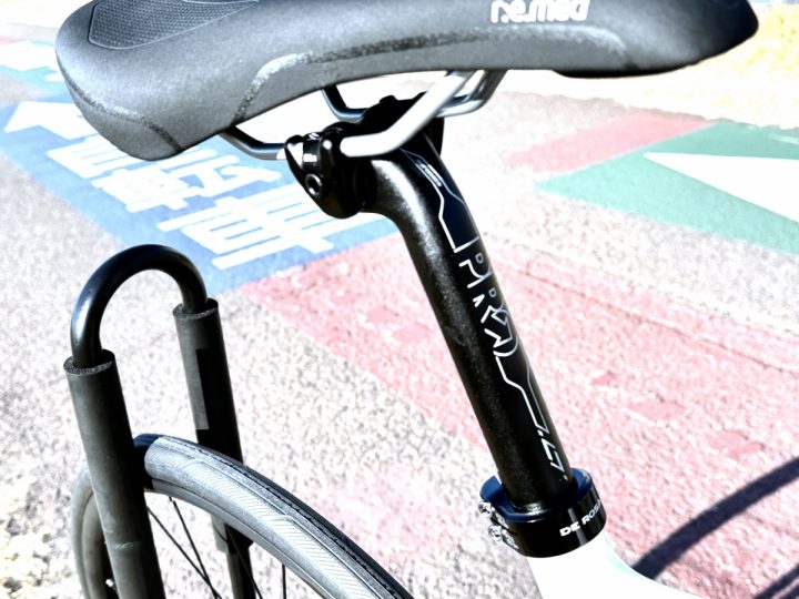 軽量で適度な剛性のフルカーボンフレームです。シャキシャキ走ります。ちなみにこのホワイトグロッシーカラーは、Y’sオリジナルカラーです。それを府中オリジナルの完成車にしてしまったので、どこにもない究極のオリジナルバイクです。コンセプトは大人の悪ふざけ!