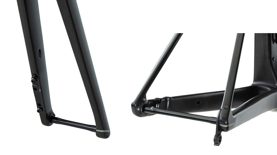 フロントフォークおよびリアのドロップアウトエンドに採用された「ステルス・スルーアクスル」。アクスルのネジ切り部をフレームに内蔵し、フレーム右側に貫通させないステルスデザイン。