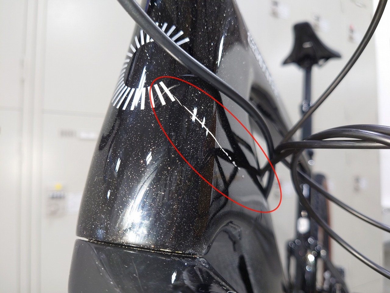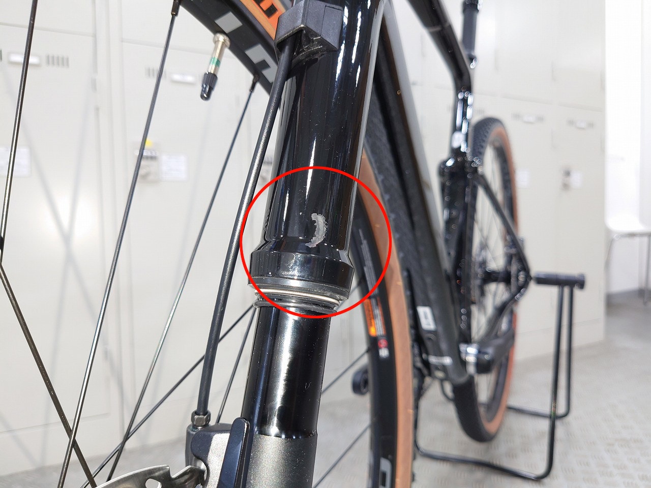 ヘッドチューブ左側、フロントフォーク下部、フロントホイールのリム左側に傷がございます。