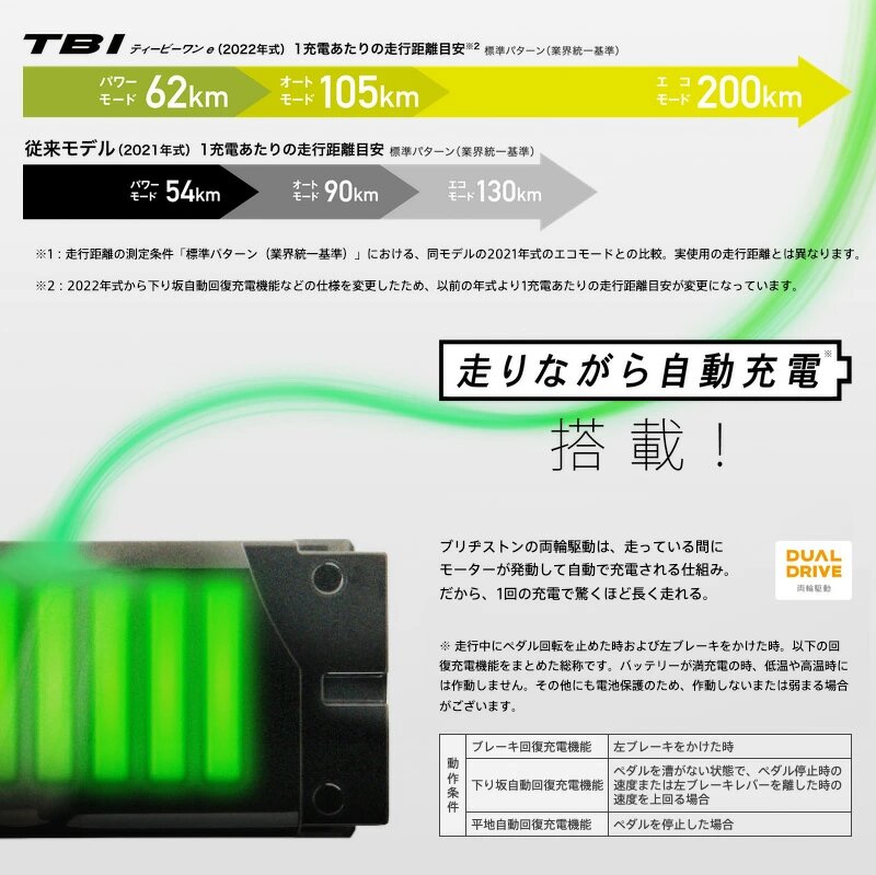 | 1充電あたりの走行距離の目安 | (標準パターン・バッテリー新品時) エコモード 200km オートモード 105km パワーモード 62km |