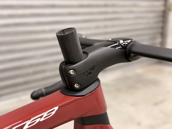 展示のためにENVEのフル内装システム「IN ROUTE」用のコンバーターに交換し、対応するハンドルとステムをセットしています。