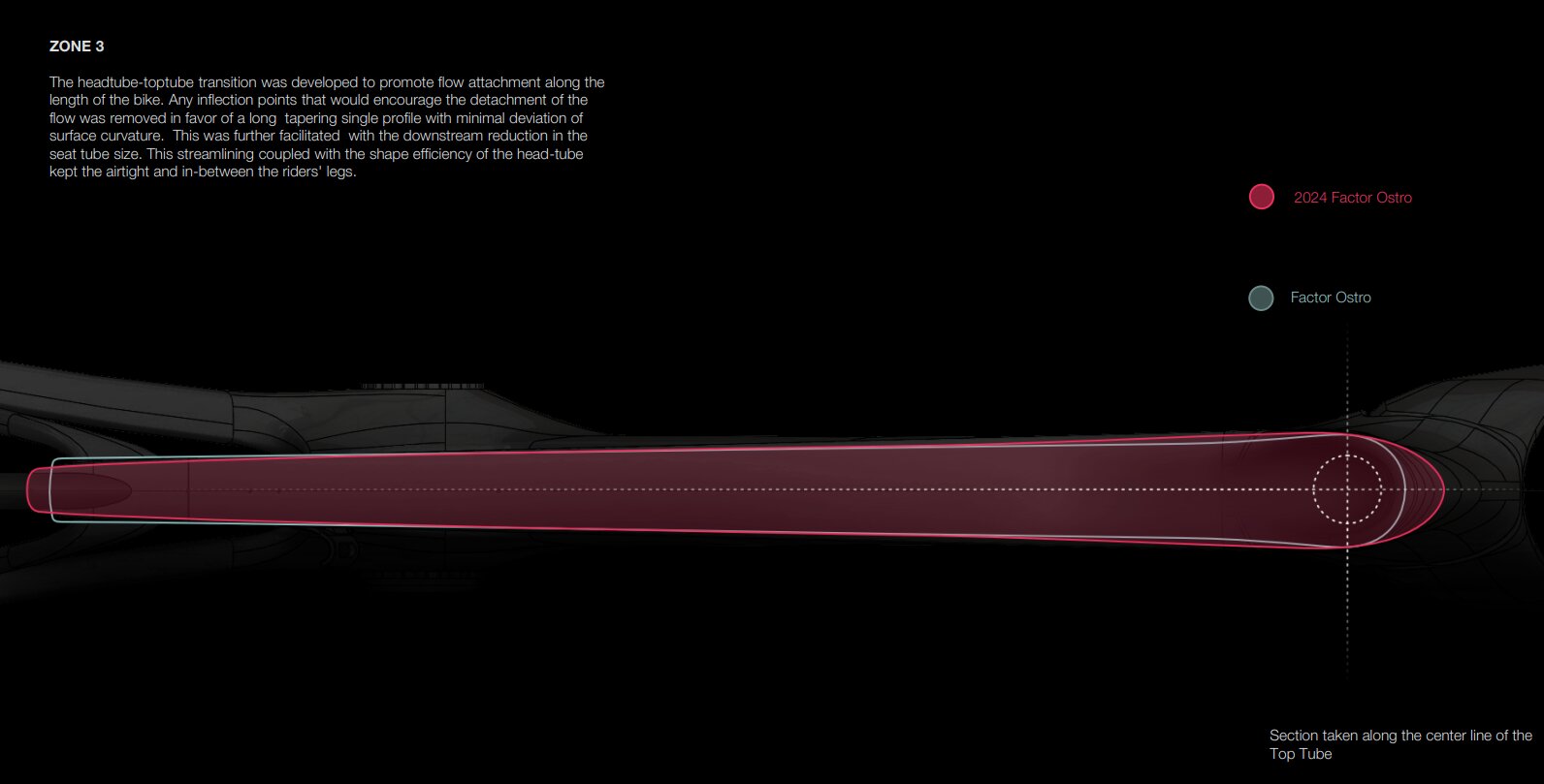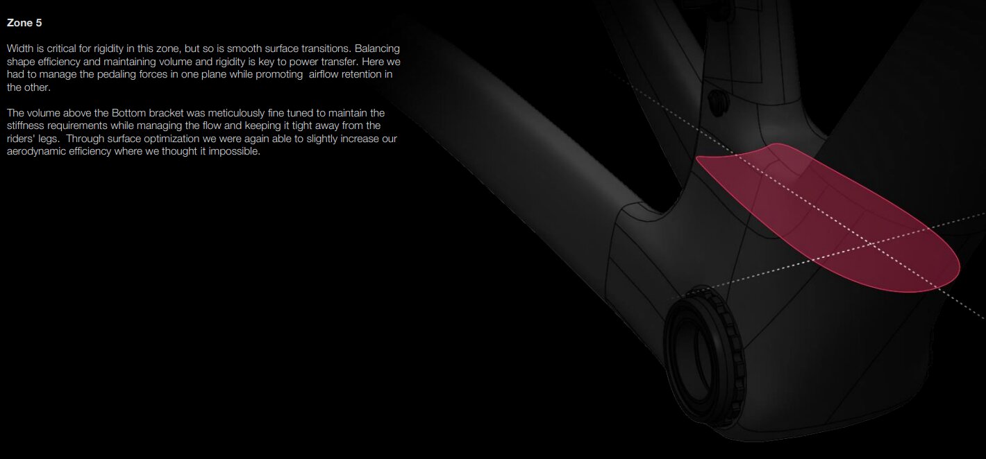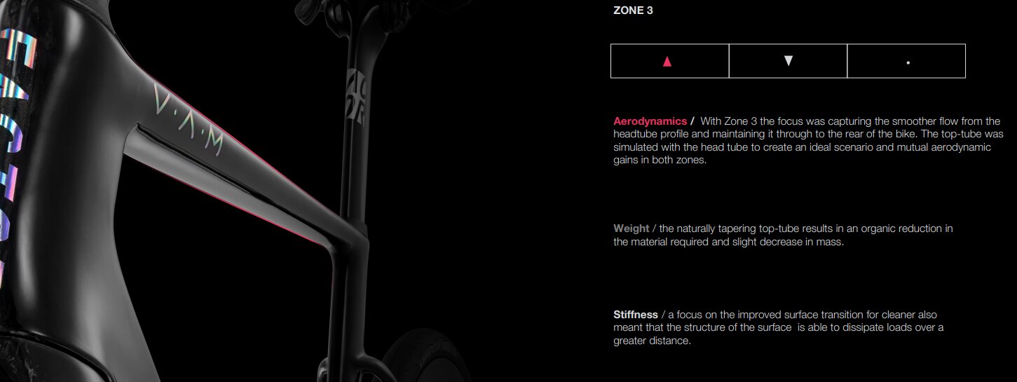 ZONE 3では、ヘッドチューブ形状からスムーズな流れをつかみ、それをバイク後方まで維持することに焦点を当てた。トップチューブはヘッドチューブと一緒にシミュレーションされ、両ゾーンでの理想的な空力的な利益がもたらされた。
