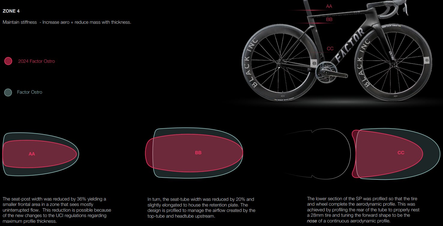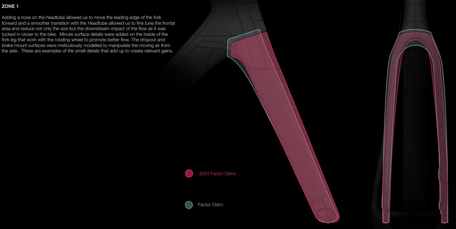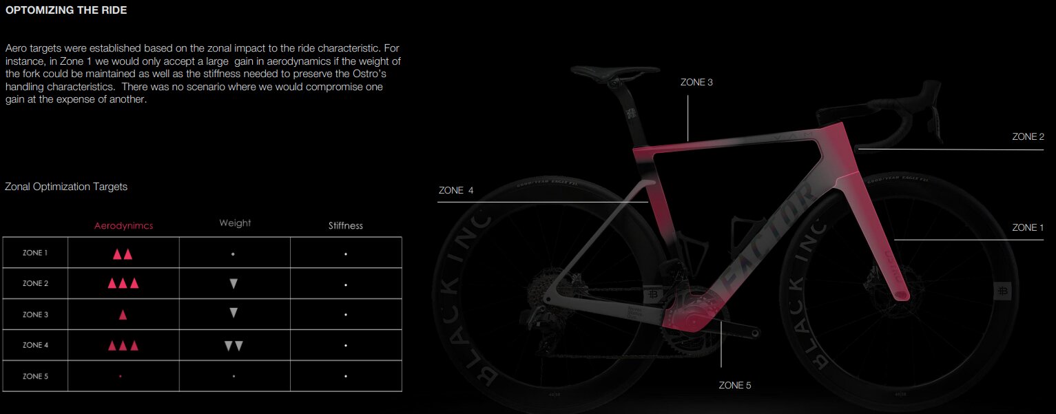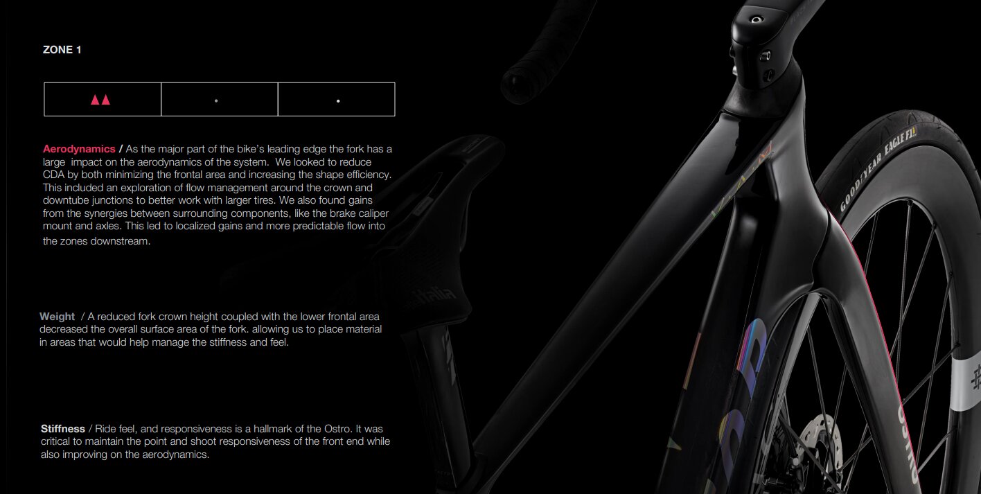 エアロターゲットは、乗り心地特性へのゾーン影響に基づいて設定された。例えば、ゾーン1では、フォークの重量を維持し、オストロのハンドリング特性を維持するために必要な剛性を確保できる場合にのみ、エアロダイナミクスを大きく向上させることを受け入れた。
