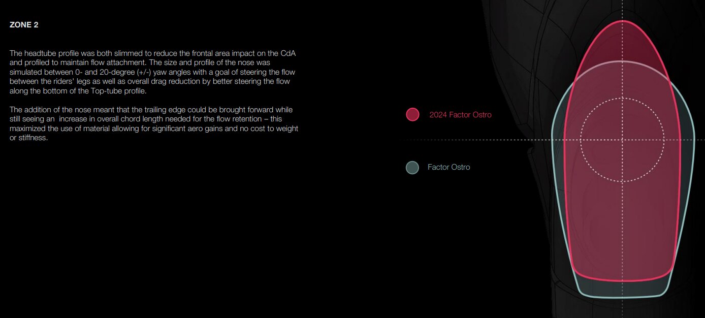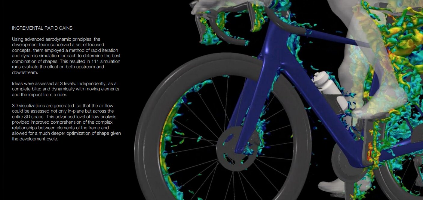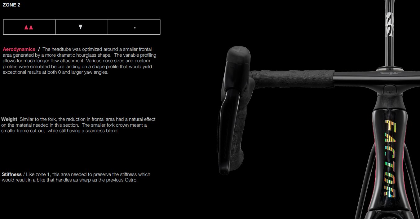 ヘッドチューブはよりドラマチックな砂時計型に進化。ヘッドノーズのサイズと形状は、0度から20度のヨー角の間でシミュレートされ、ライダーの脚の間で流れを操ることと、トップチューブの形状に沿って流れをより良く操ることで全体的なドラッグを減らすことを目標とした。