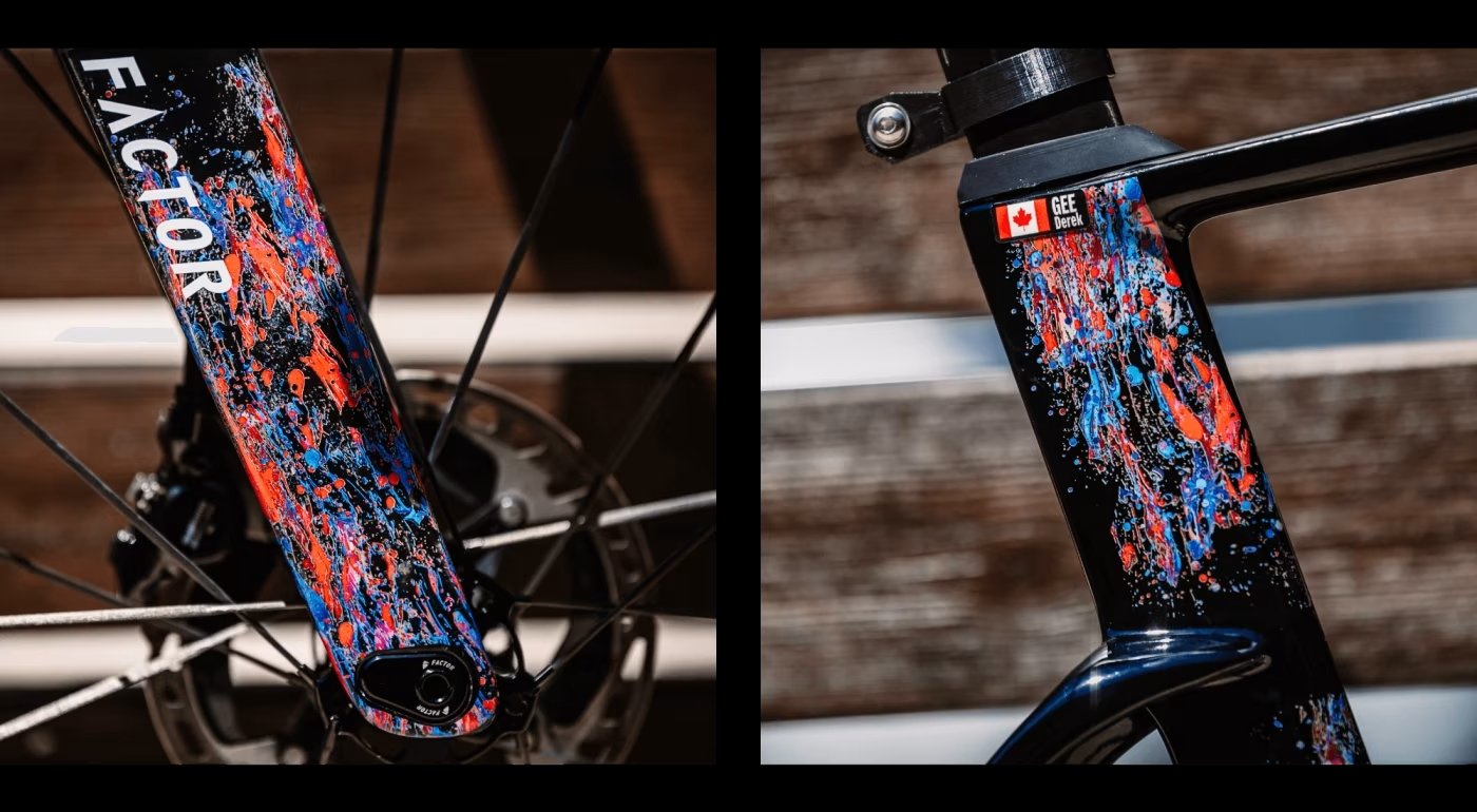 「そしてこれはただの飛沫ではなく、縞模様を描いています。これはスピードと動きを表現したもので、ファクターというブランド、そしてロードレースへのオマージュです」とグラフィックのコンセプトを語っている。