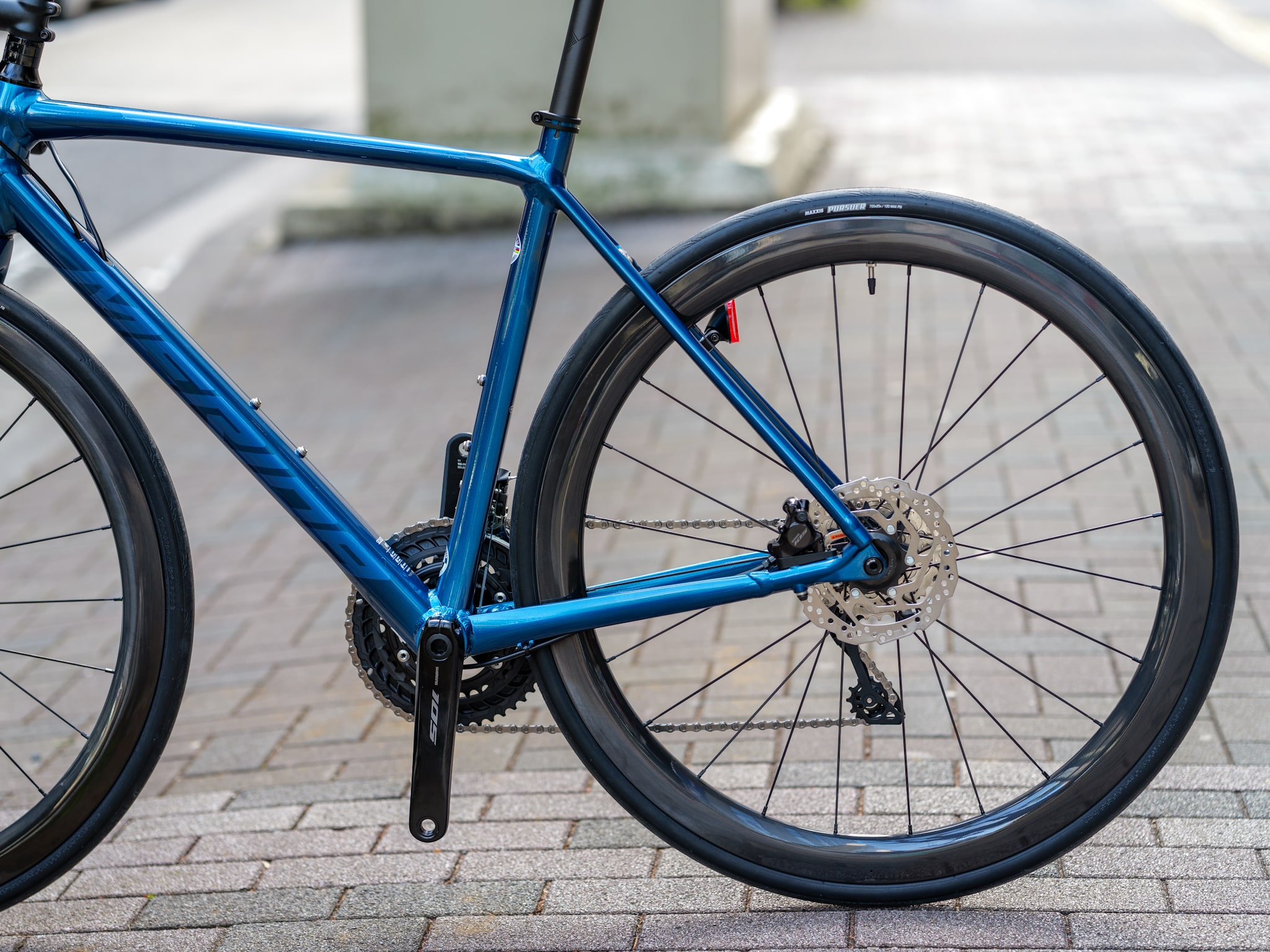 カーボンスポークではなく空力性能に優れたエアロ形状の軽量ステンレス製ストレートスポークを選定しました。