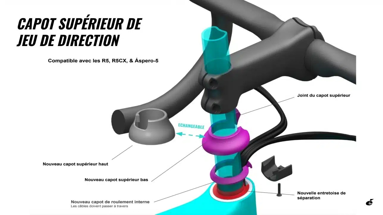 そこで、ステムの下にケーブルを通し、ベアリングキャップを貫通させる方式を独自に開発しました。