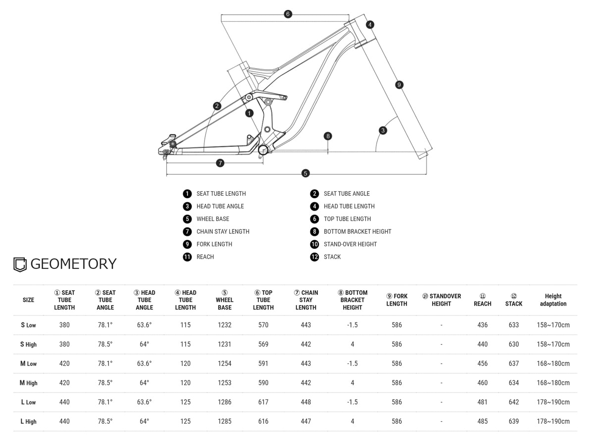 ジオメトリを調整することで、ライディングスタイルによりフィットすることが 可能です。 この可変ジオメトリシステムにより、BBハイト、ヘッドアングル、シートアング ルを簡単に変更していただけます。ライダーの好みに合わせて、ペダリング重視 のジオメトリ(HIGHタイプ)と、バイクパークや下りのトレイルに最適なサスペ ンションの作動感重視の、プログレッシブバージョン(LOWタイプ)を選択する ことができます。