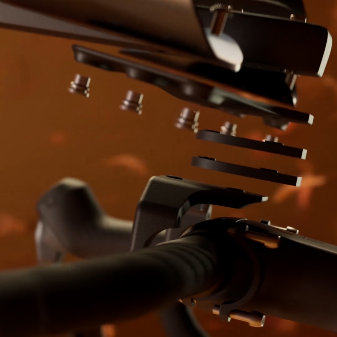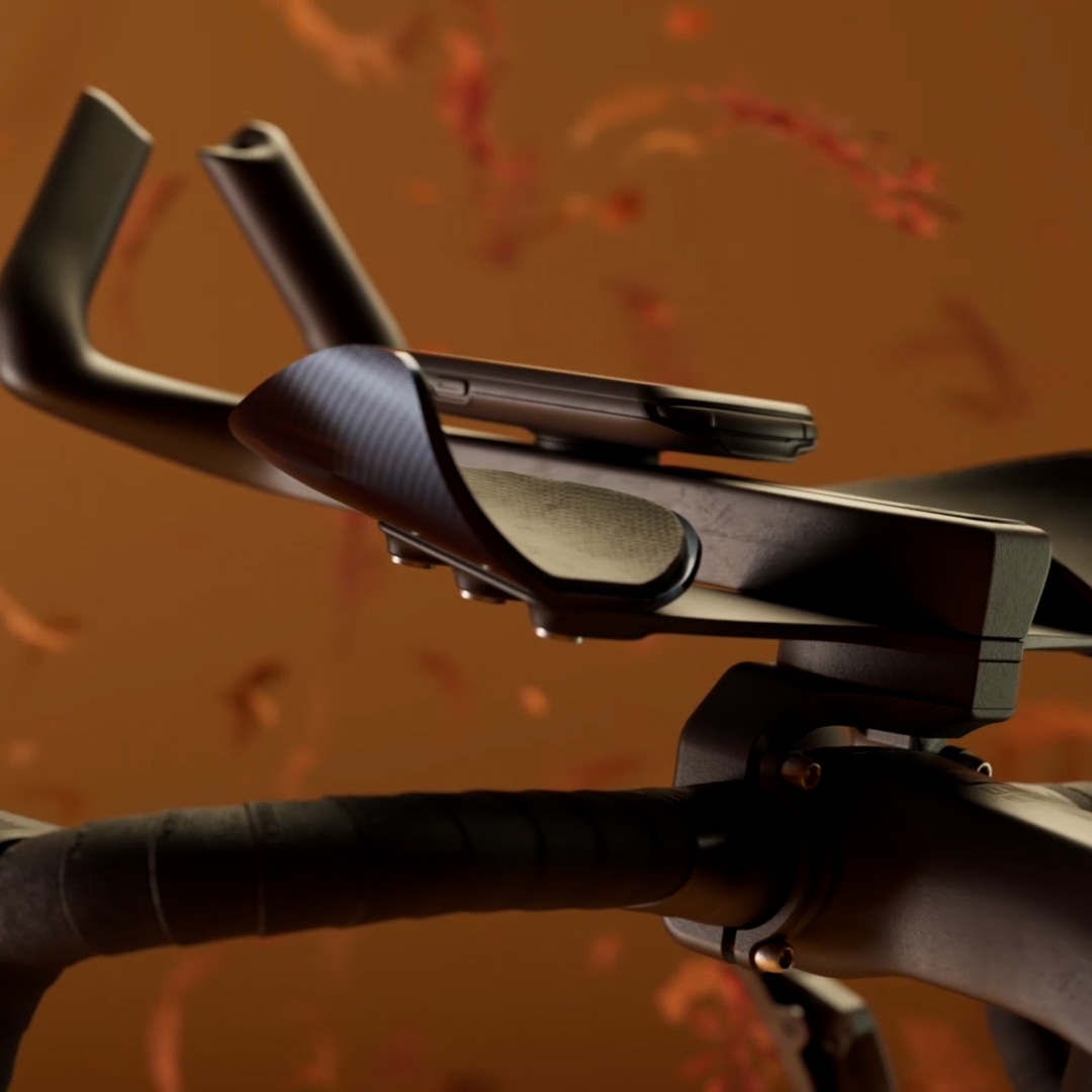 Jaguarの丸型ハンドルバーにクランプ固定されたソリューション。エクステンションとパッドのリーチとスタックが調整可能。エクステンションにコンピュータマウントが統合されています。調整可能なチルト機能。