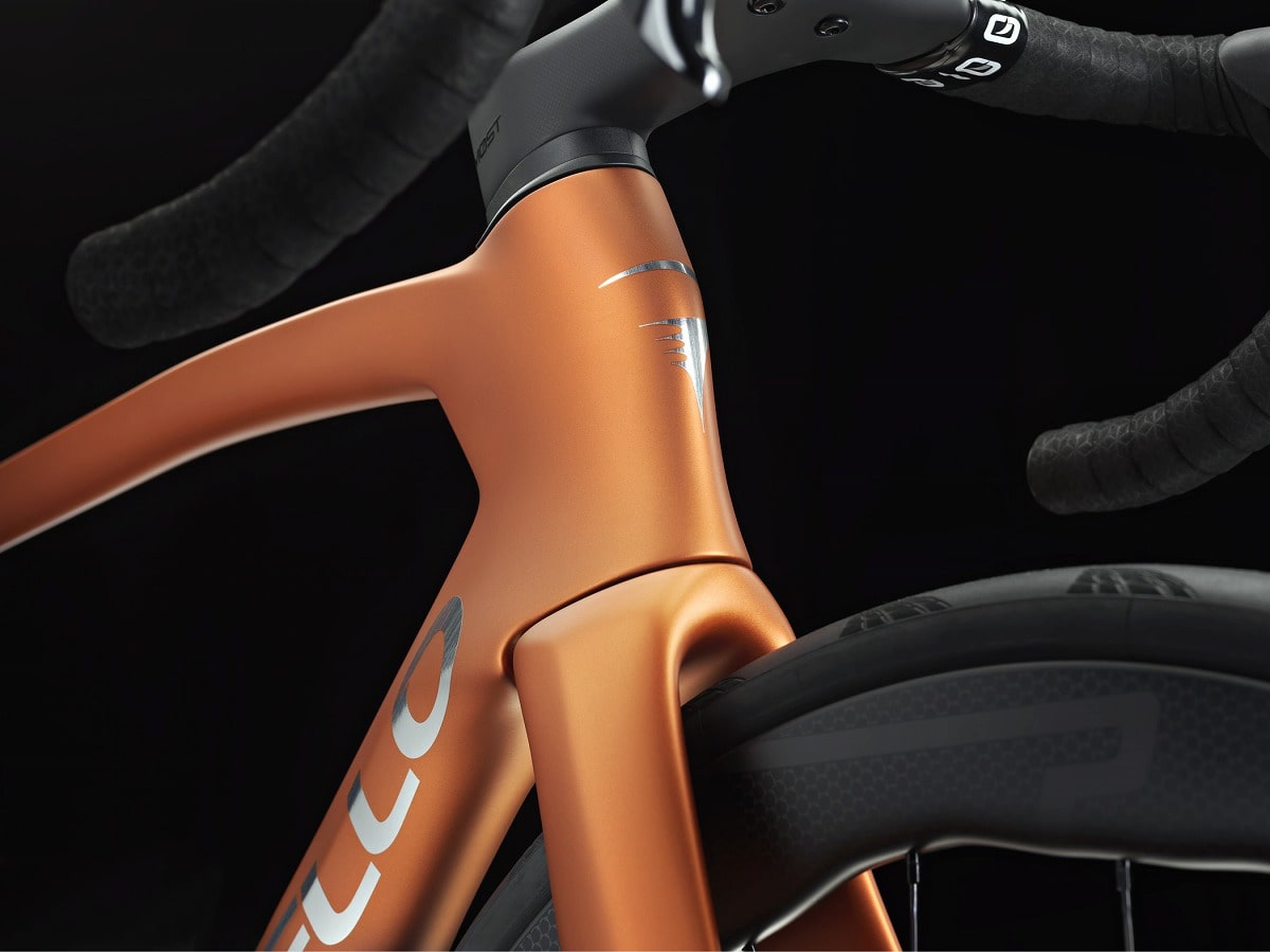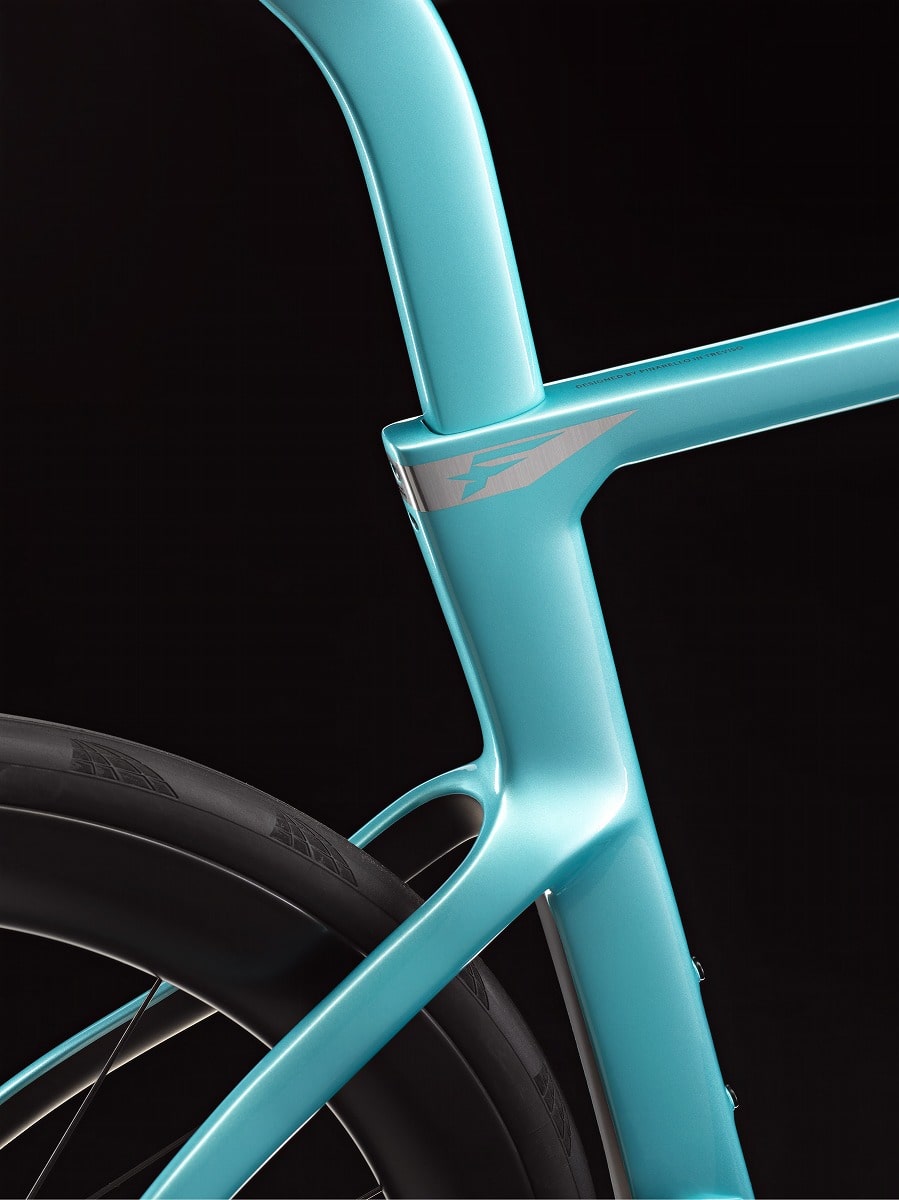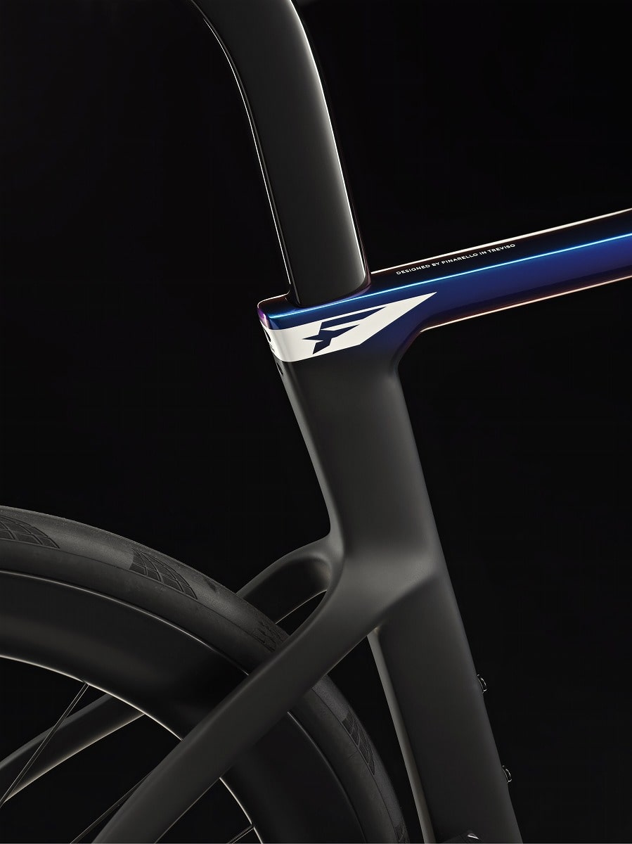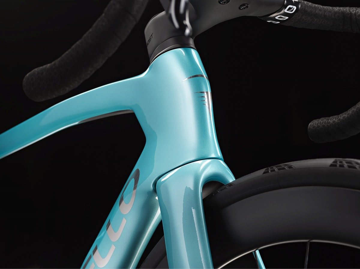 独自のヘッドチューブノーズ形状 - 2014年にDOGMA F8で初めて導入され、多くの競合他社に模倣されたもの - が再び進化しました。ノーズエリアの体積と幅を8mm減少させ、より流線型のデザインにより前面空力性能が向上しました。