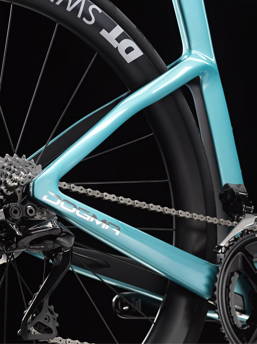 開発の初期段階からDOGMA Fのデザインは、細部に渡って統合的に設計されており、サイズに関係なくフレームの特性、性能は同じになるよう設計されています。単にチューブを長くしたり短くしたりするだけでなく、角度や積層を変えてセクション全体のバランスを取ります。ひとつのゴールを念頭に置いて、誰もが等しくDOGMA Fの卓越したパフォーマンスとクオリティを体験できるようにしているのです。