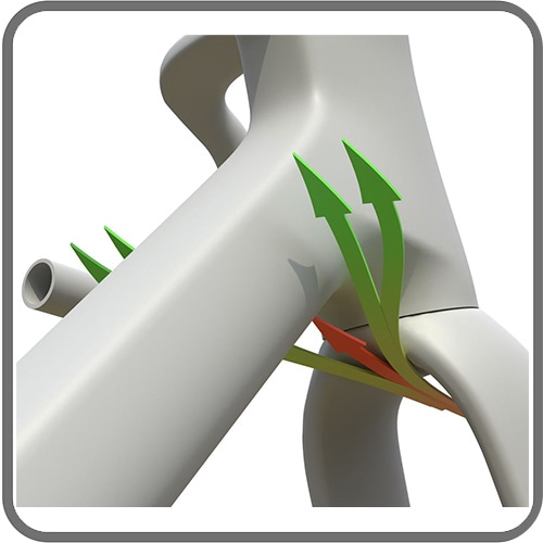 フォーククラウン内側の空気の整流効果と後方に抜ける気流の速度を上げることで、ダウンチューブ周囲の空気抵抗を最小限に抑え、ディフューザー設計ではないフォークと比較して、時速50km/hで10%の空気抵抗を低減。