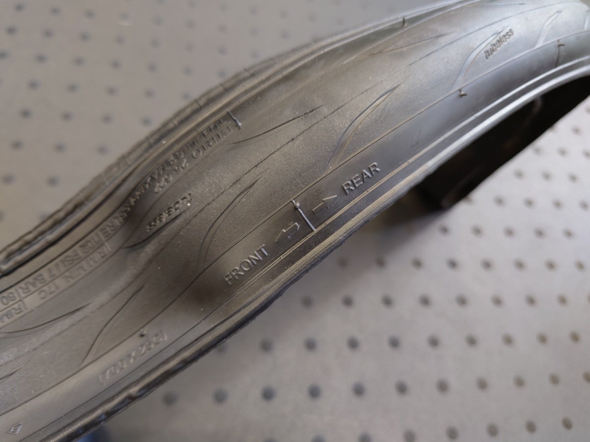 前後でタイヤのローテーションの向きが変わりますので、タイヤ側面のFRONTO/REARの表示をご確認の上、お取り付けをお願いいたします。