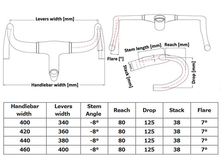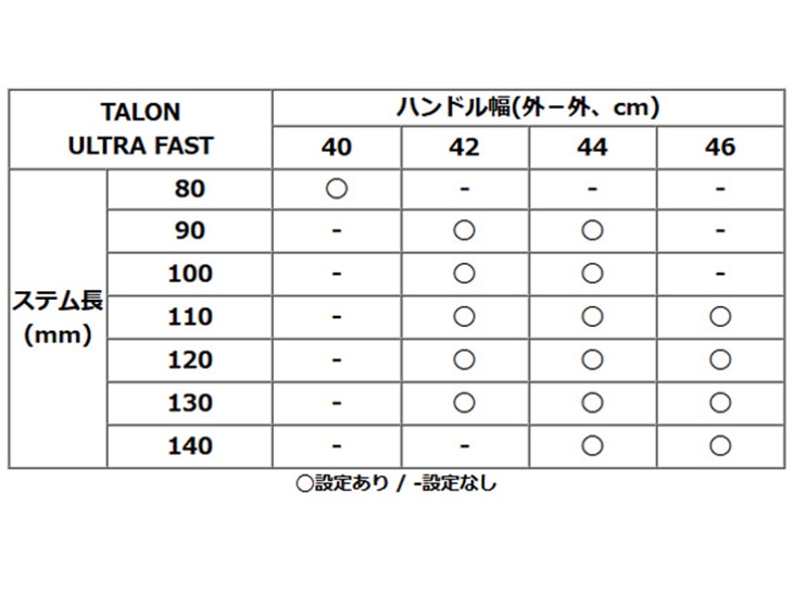 | ハンドル幅/ステム長 | 40cm: 80mm 42cm: 90/100/110/120/130mm 44cm: 90/100/110/120/130/140mm 46cm: 110/120/130/140mm (バーエンド部の外〜外サイズ表記) |