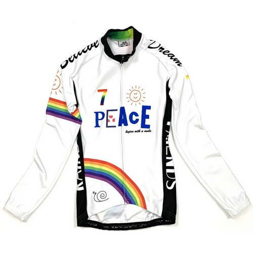 定番となったレインボーは、自転車、車、老若男女、人種、主義主張などを超えて、様々な考えを持った人々が「共存」する世界を祈ってデザインされています。雨の後に虹が出る様に、落ち込んだ時もこのジャージをみたら少しだけ元気が出る事を願っています。