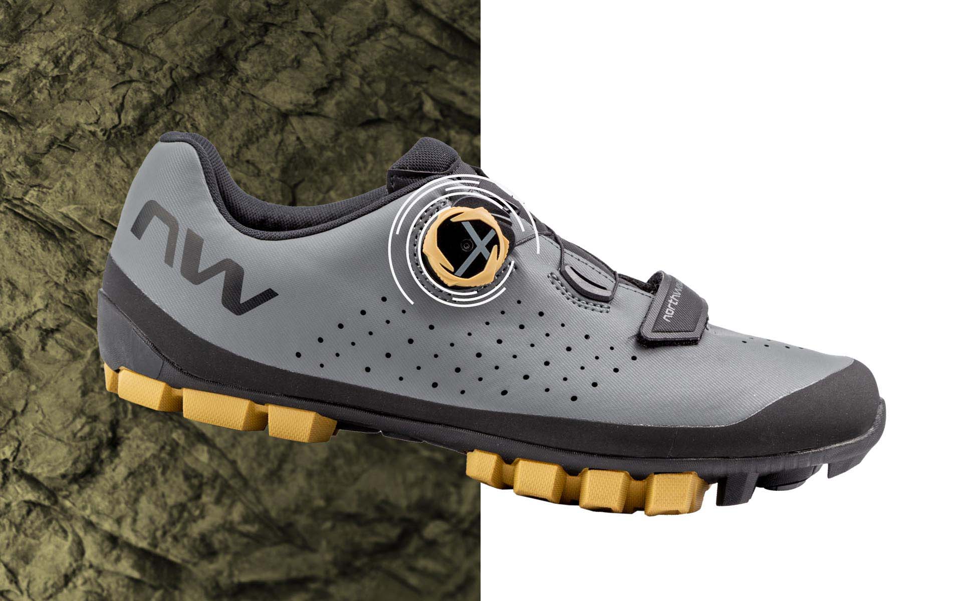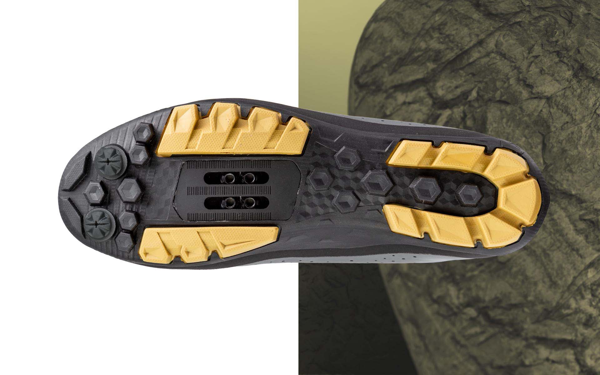 クロカン性能と、あらゆる地形で確実に歩けるトラクションを両立させた構造のソールです。先進的な「フレキシ・システム」と「アーチサポート」が特長で、ペダルエリアへの純粋なパワーを解き放ち、バイクを降りて使用する際も快適な履き心地を誇ります。