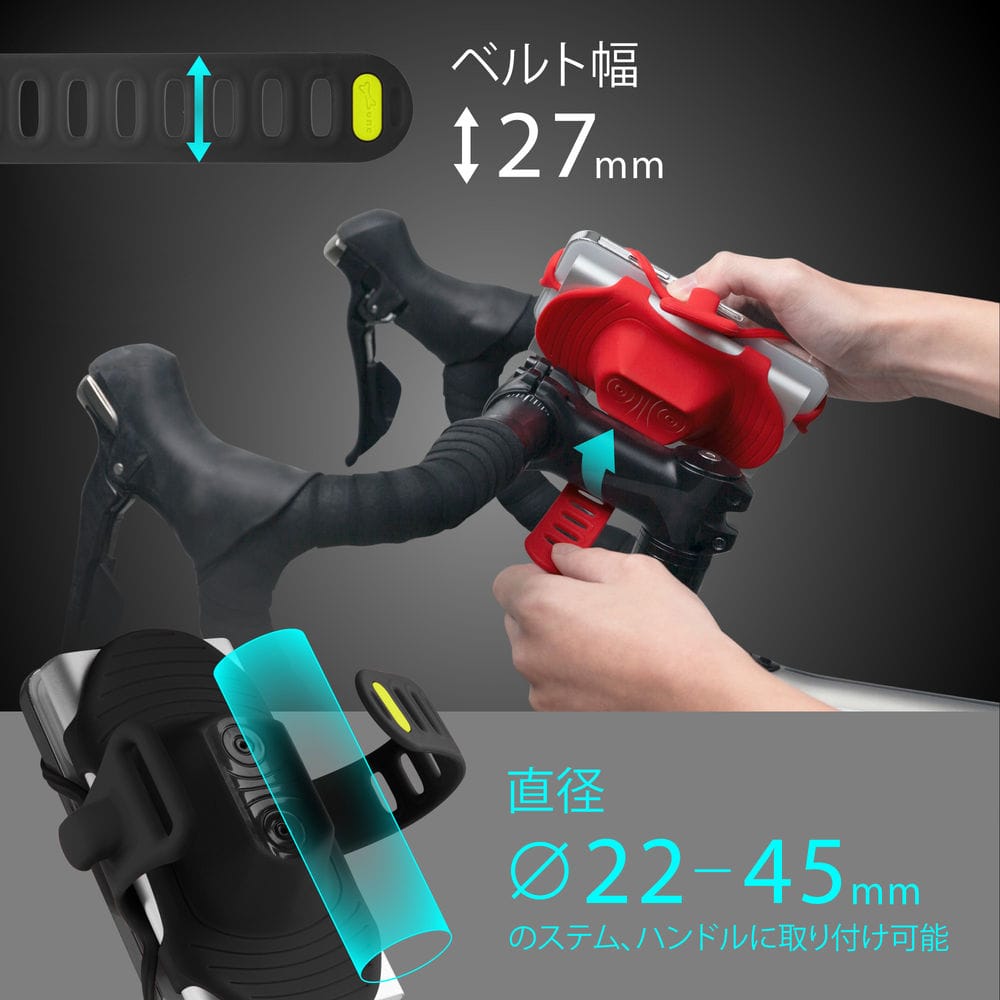 - シリコン素材の固定バンドで直径22mm~45mmのステム、ハンドルに取り付け可能