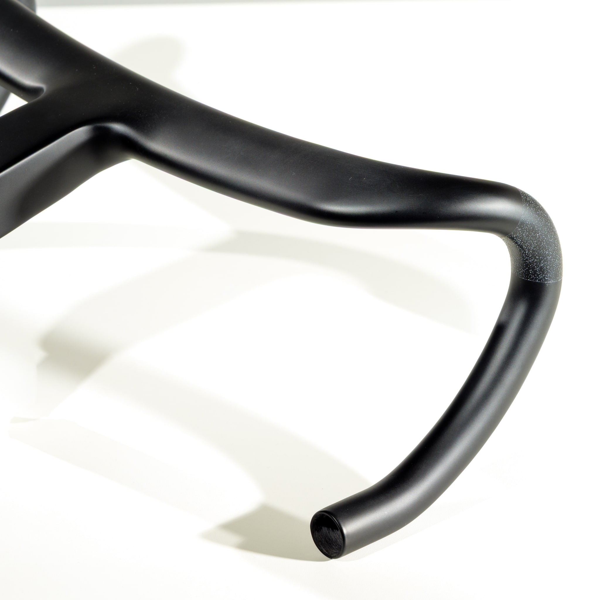 過度な前傾を強いるのではなく安定性と快適性を重視したエンデュランス設計を採用し、 ステム角度は一体型ハンドルに多く見られる80度ではなく、一般的な完成車と同じ84度としています。 ハンドルセンターからブラケット部にかけて緩やかな上反角を持たせることで、 よりリラックスしたポジショニングを実現し、レースからロングライドまで幅広いシーンに対応します。