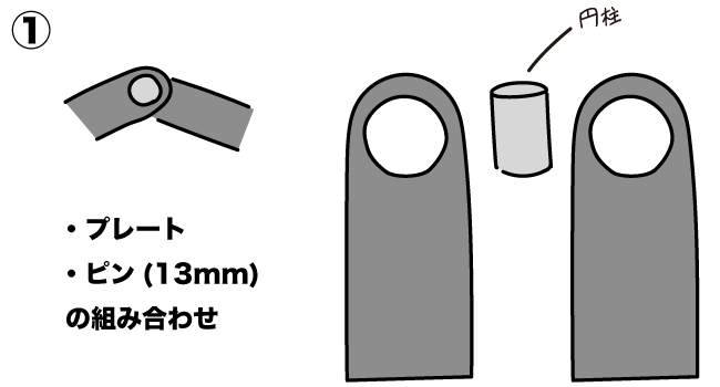プレートにピンを通し、両側からピンを押しつぶしてカシメを行い固定します。