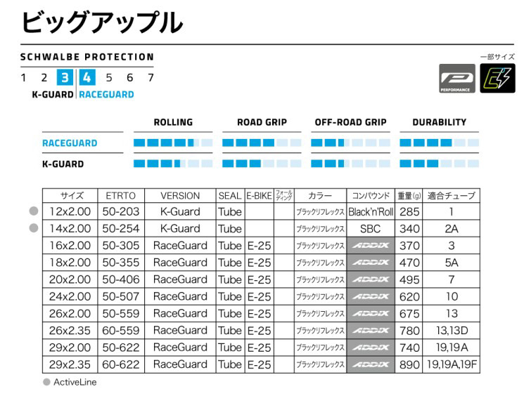 | 特徴 | ・バルーンバイクというトレンドを生み出したビッグアップル ・大きなエアボリュームにより、スムーズな回転と快適な乗り心地を実現 ・特殊ゴムと50EPIのケブラー繊維で作られたプロテクションベルト「Kガード」でパンクを抑制 ・夜間も安心なリフレクター付き |