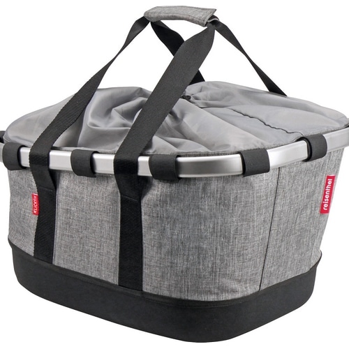 持運びに便利な持ち手付きで、買い物時のマイバッグにオススメ。バッグ上部のフレームは傾斜のあるデザインで、キャリア装着時にサドルへの干渉を防ぎ、巾着式カバー付きで自転車走行中の荷物の飛出しを防止します。