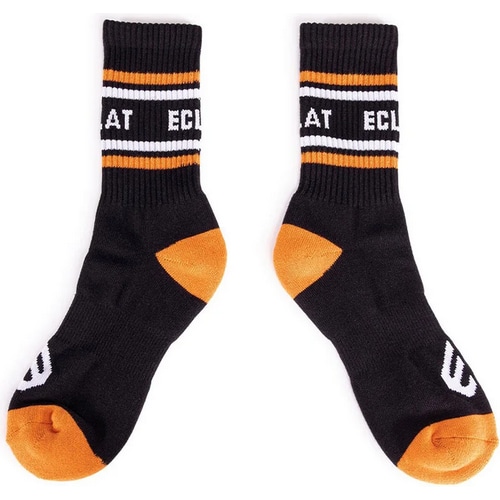 ECLATのロゴの入ったソックス。オレンジ色の差し色が入っています。