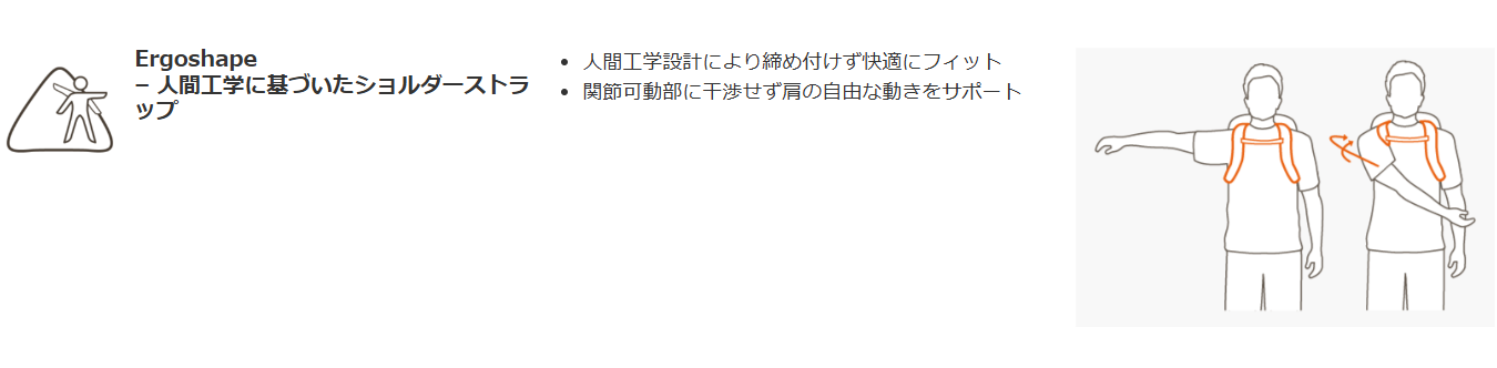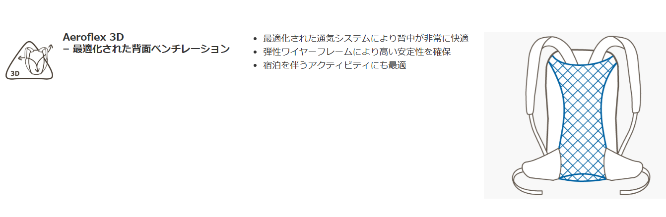 通気性に優れたエアロフレックス3Dサスペンションを搭載しているだけでなく、長さ調節可能な背面、パッド入りのヒップストラップとショルダーストラップ、ハイドレーションチューブホルダー付きチェストストラップにより、快適な背負い心地が長続きします。