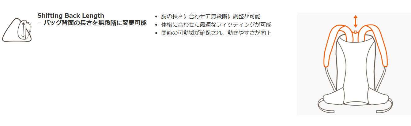 | 仕様・機能 | フロントコンパートメントにオーガナイザー キーホルダー 自転車ポンプホルダー サイドメッシュポケット ヘルメットホルダー ポケット付きパッド入りヒップベルト チューブホルダークリップ付きスターナムストラップ ハイドレーションシステム用開口部 セーフティライトアタッチメント サイドコンプレッションストラップ 反射エレメント 大型メインコンパートメント 内側にジッパーポケット付きメインコンパートメント |