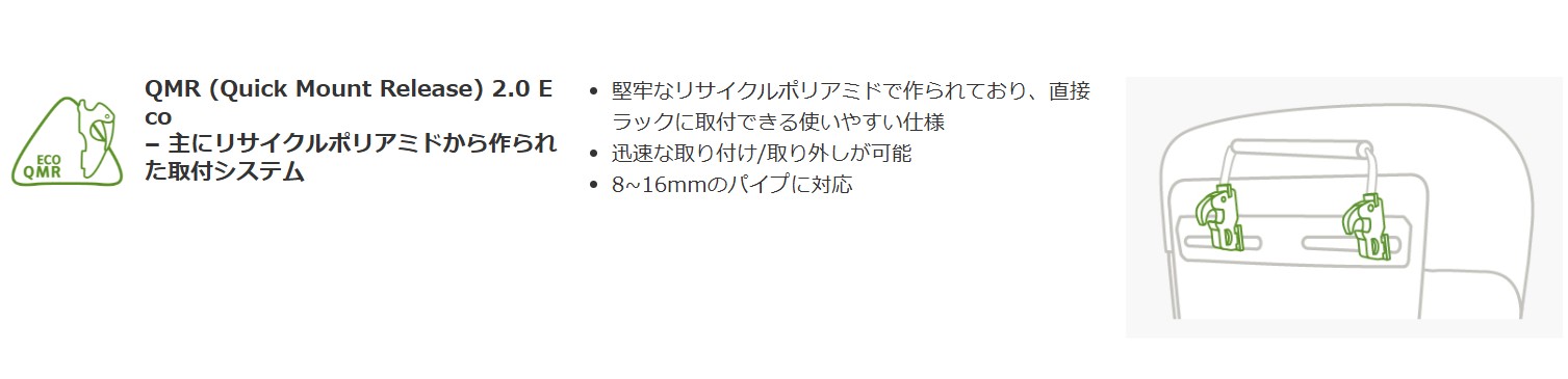 クイックマウント・リリースシステムは高品質で高機能な、VAUDEパニアバックのためのフック付きアタッチメントシステムです。工具不要でしっかり固定でき、素早く取り付け、取り外しが可能。