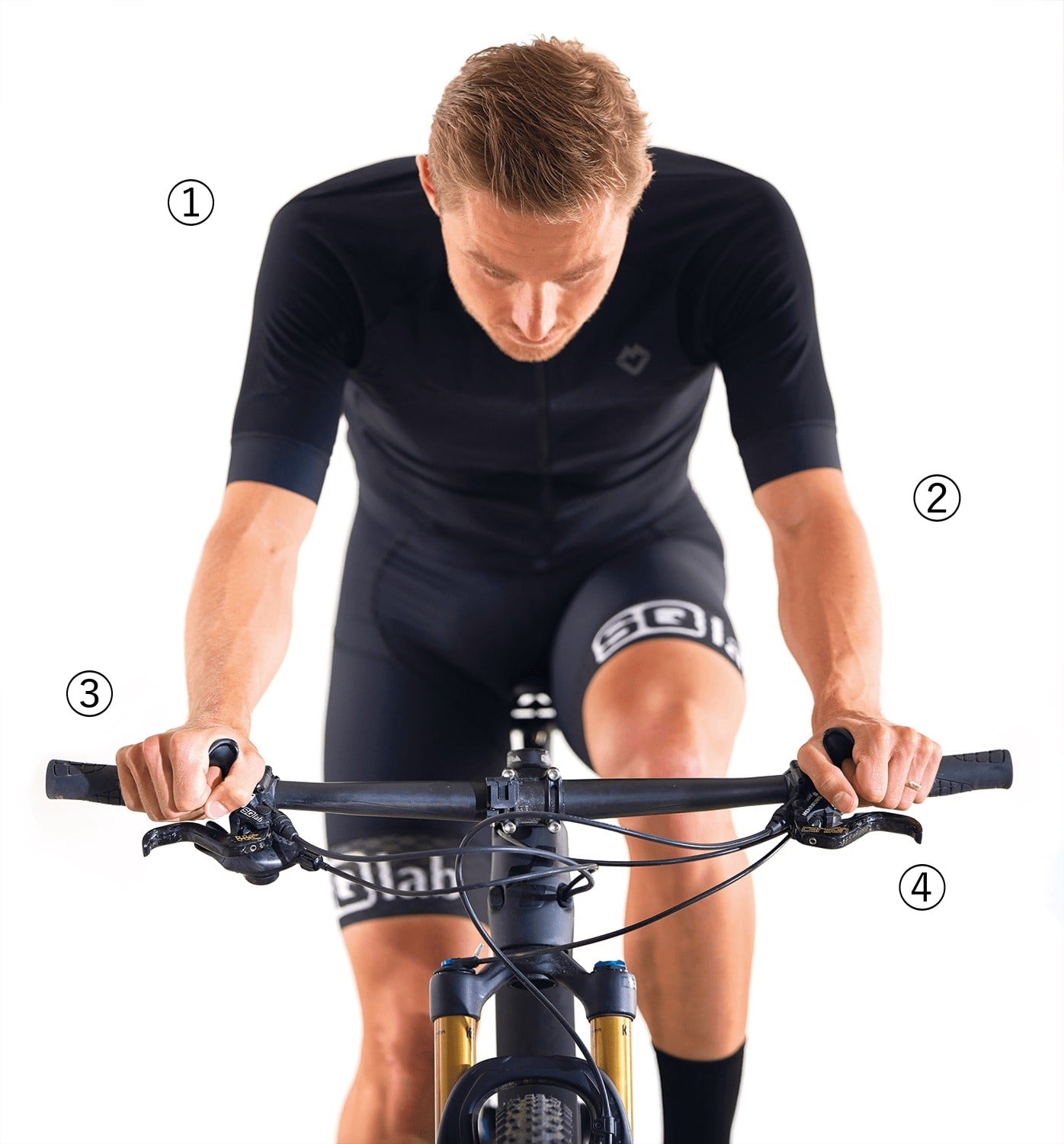 エアロダイナミクスを考慮したリラックスした肘の位置が、最高速度を生み出します。「57ワットの節約!つまり、状況によっては、同じ努力で時速2〜5kmもスピードが上がるのだ!」―Bike Magazine 08/20