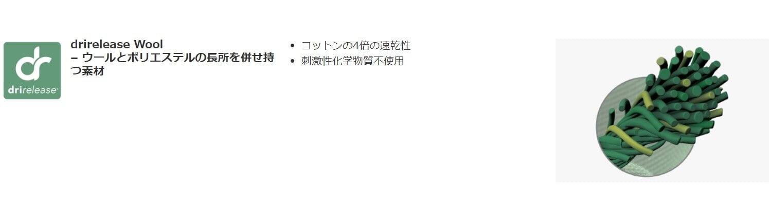 高性能のdrireleaseにより、軽量で速乾性に優れ、ウールを混紡することで効果的な温度調節を可能にし、防臭効果もあります。