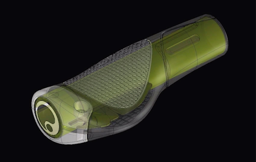 エルゴングリップには図のような形状の硬質プラスチック芯が入っています(グリーン部分)。このパドルの上にクッション性の高いソフトラバーとホールド性のいいミディアムラバーを配し、その厚みも箇所ごとに絶妙に変化させています。