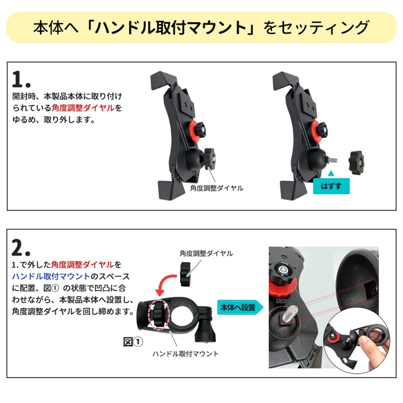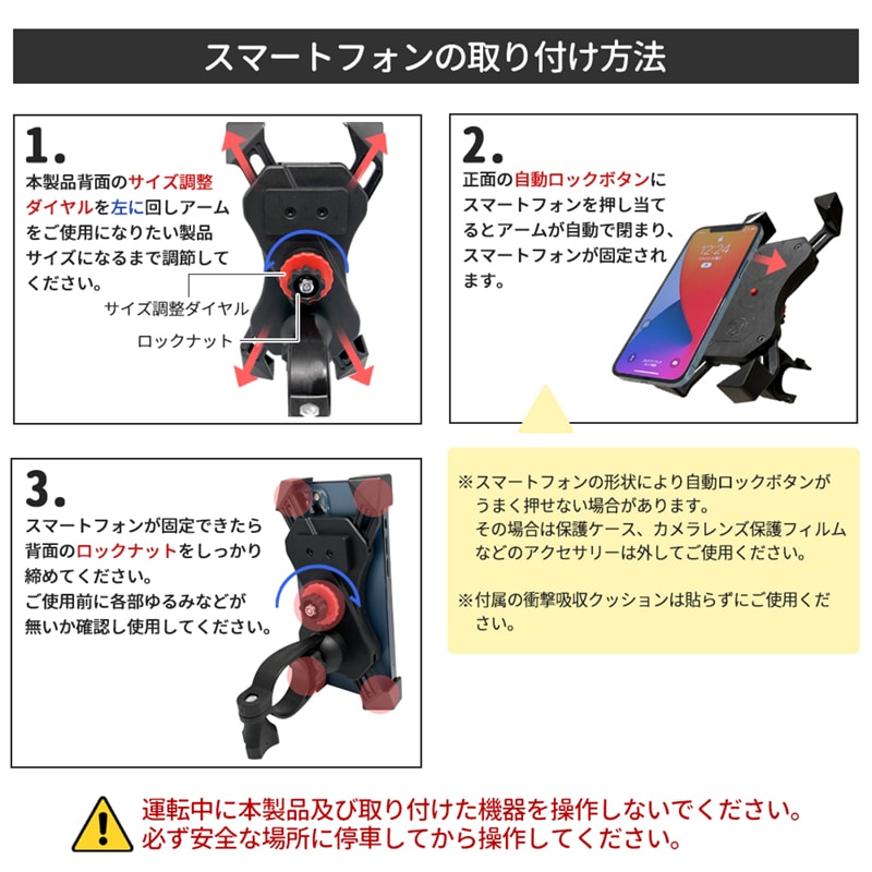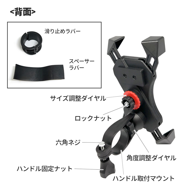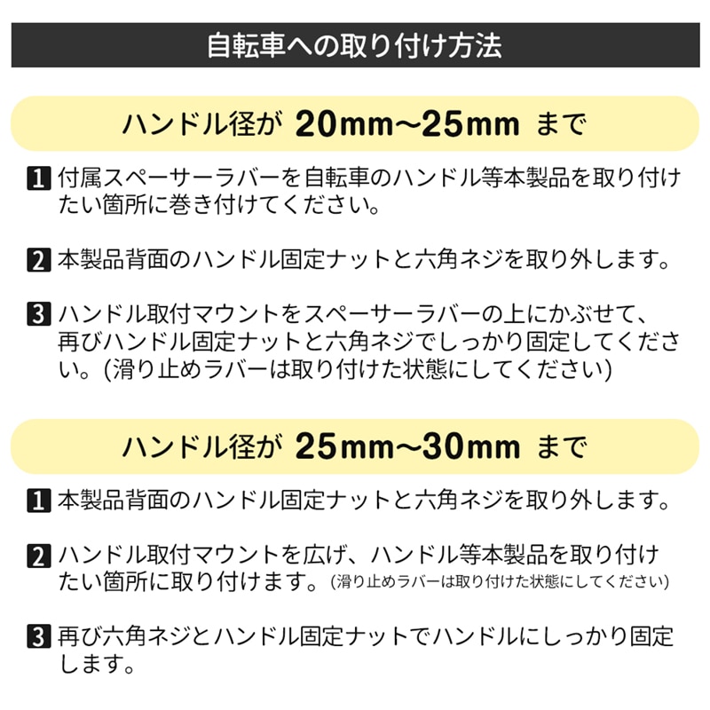 | 対応クランプ径 | およそ20-30mmまで対応 ※オートバイへの装着はバーハンドルタイプに限ります |