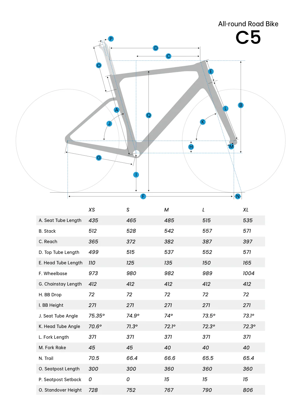 C5はエンデュランスの特性を併せ持っていますが、アップライトすぎるジオメトリは採用しておらず、万人が乗りやすいオールラウンドモデルのジオメトリが採用されています。そしてフレームチューニングは安定性に振ってあります。