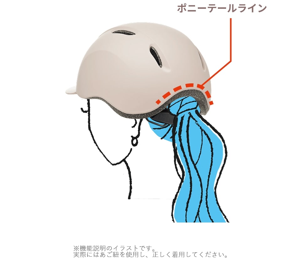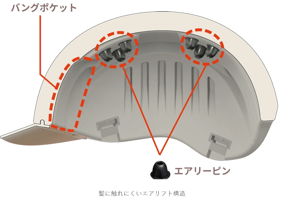 前髪を押さえつけない「バングポケット」と、ヘルメットと頭の隙間を生む12個の「エアリーピン」が髪をふんわりと支えます。