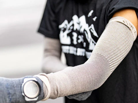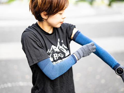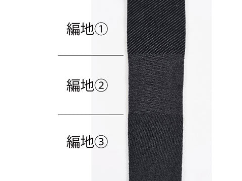 上腕、肘、前腕、の3つのエリアに分けて編地を変える事で、柔らかいのにズレ落ちにくい構造を実現。