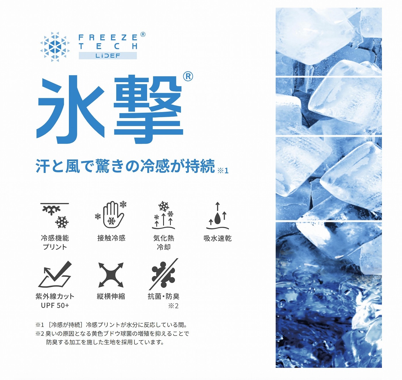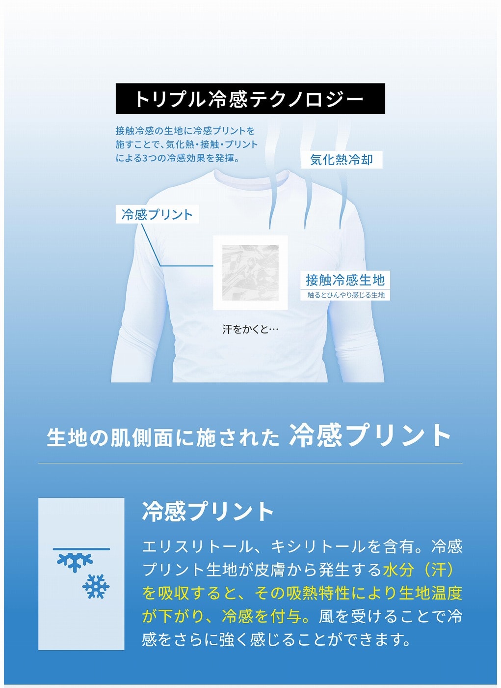 冷感機能プリント 接触冷感 気化熱冷却 吸水速乾 紫外線カット UPF50+ 縦横伸縮 抗菌・防臭 |