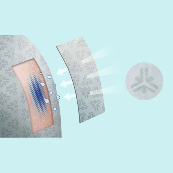 FREEZE TECHは接触冷感生地に加え、裏地全面にエリスリトール、キシリトールを含有した特殊プリントを施しています。この"特殊冷感プリント"で処理した繊維が、人の皮膚から発生する水分(汗)を吸収すると、その吸熱特性により繊維の温度が下がり、持続的に冷感を付与します。