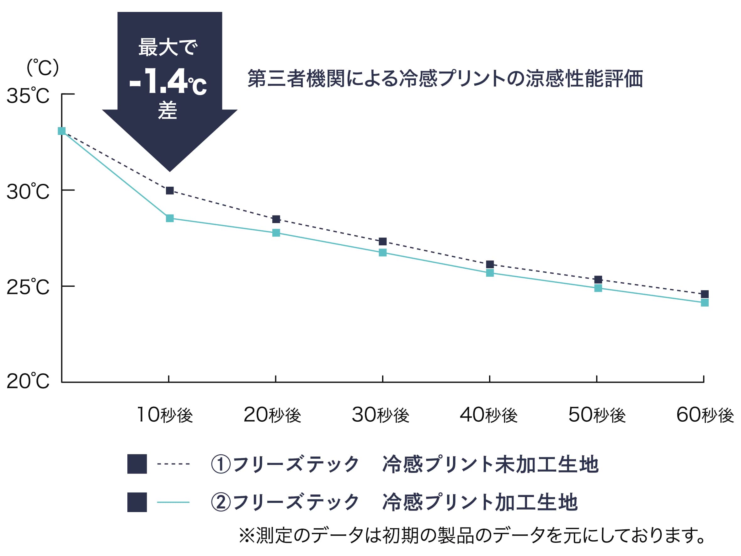 Freeze Techのプリントによる吸湿吸熱機能付加のグラフです。吸湿吸熱機能付加により、未加工布より最大「-1.4℃」も生地温度が下がります。