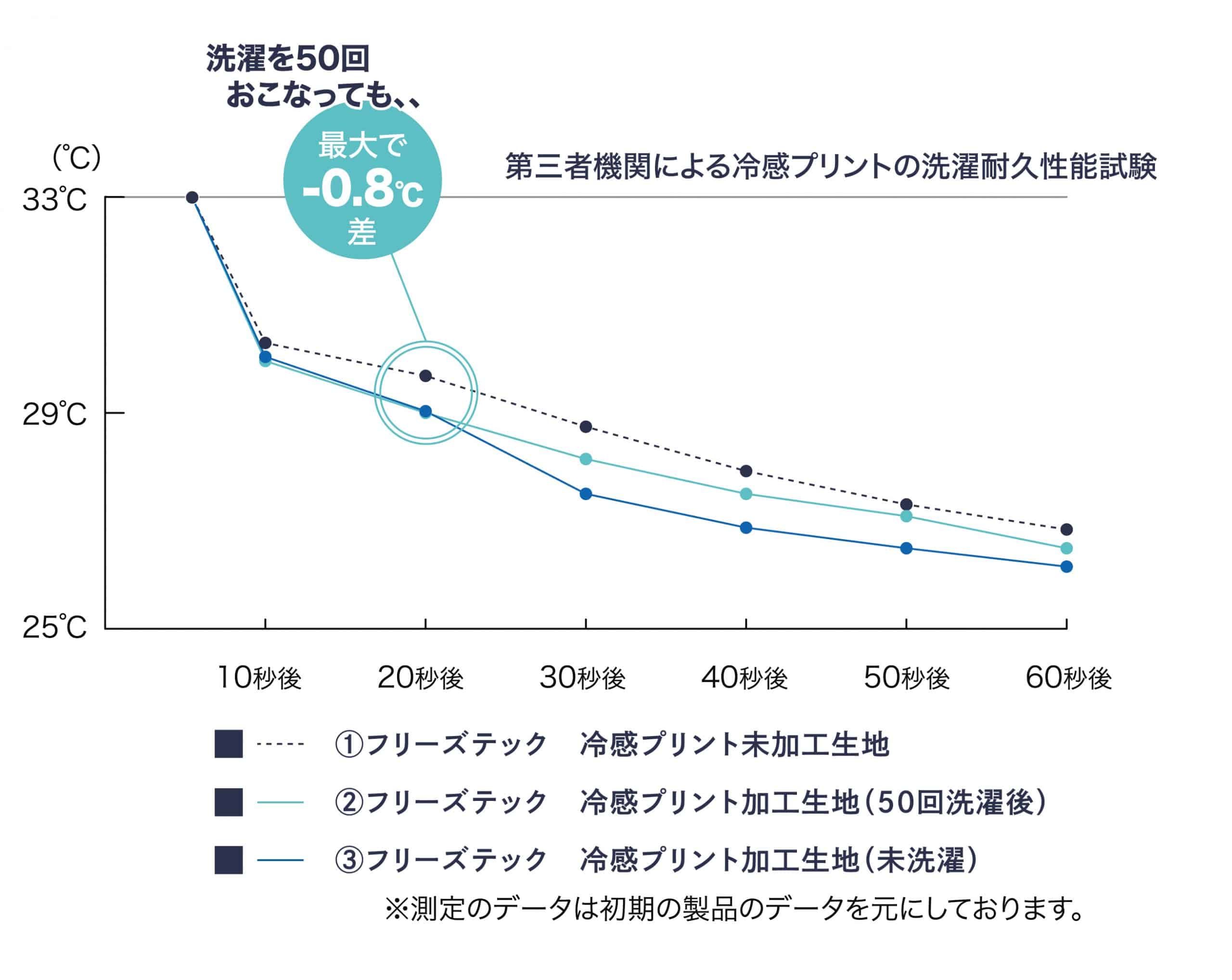 水との化学反応で熱を奪う特性のある「キシリトール・エリスリトール」は水に溶けやすく、従来の選択耐久性を持たせるのは難しい素材でしたが、特殊技術により、ナノ粒子化したインクを使用し、耐久性のあるプリントを施すことで、優れた選択耐久性を実現。このグラフは、新品のFreeze Techと洗濯実験後の涼感性能の差を比較しています。