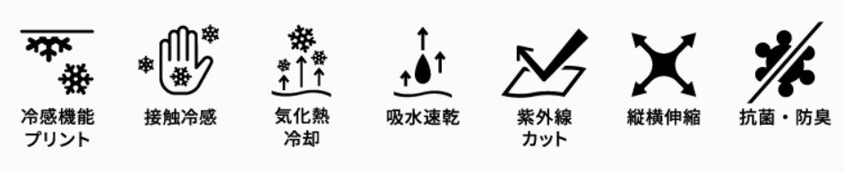 | 仕様・機能 | ・冷感機能プリント ・接触冷感 ・気化熱冷却 ・吸汗速乾 ・紫外線カット ・縦横伸縮 ・抗菌防臭 |