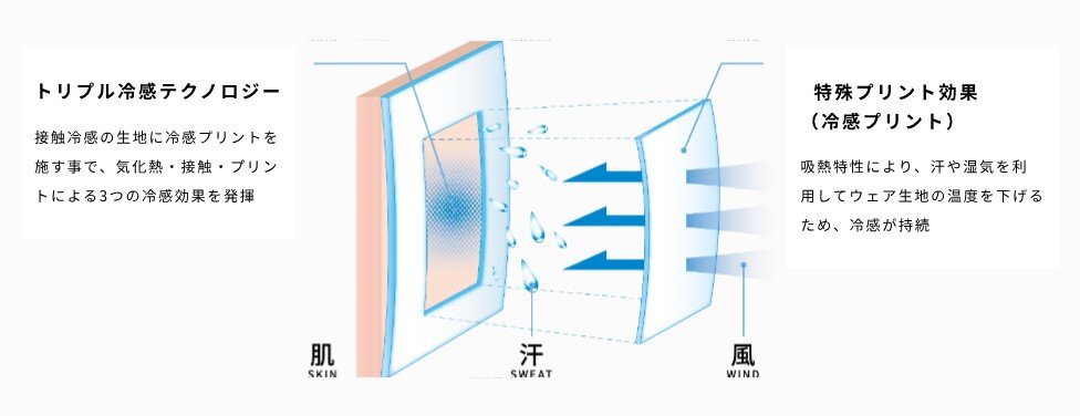 接触冷感の生地に冷感プリントを施すことで、気化熱・接触・プリントによる3つの冷感効果を発揮。猛暑対策に特化した氷撃ウェアが完成